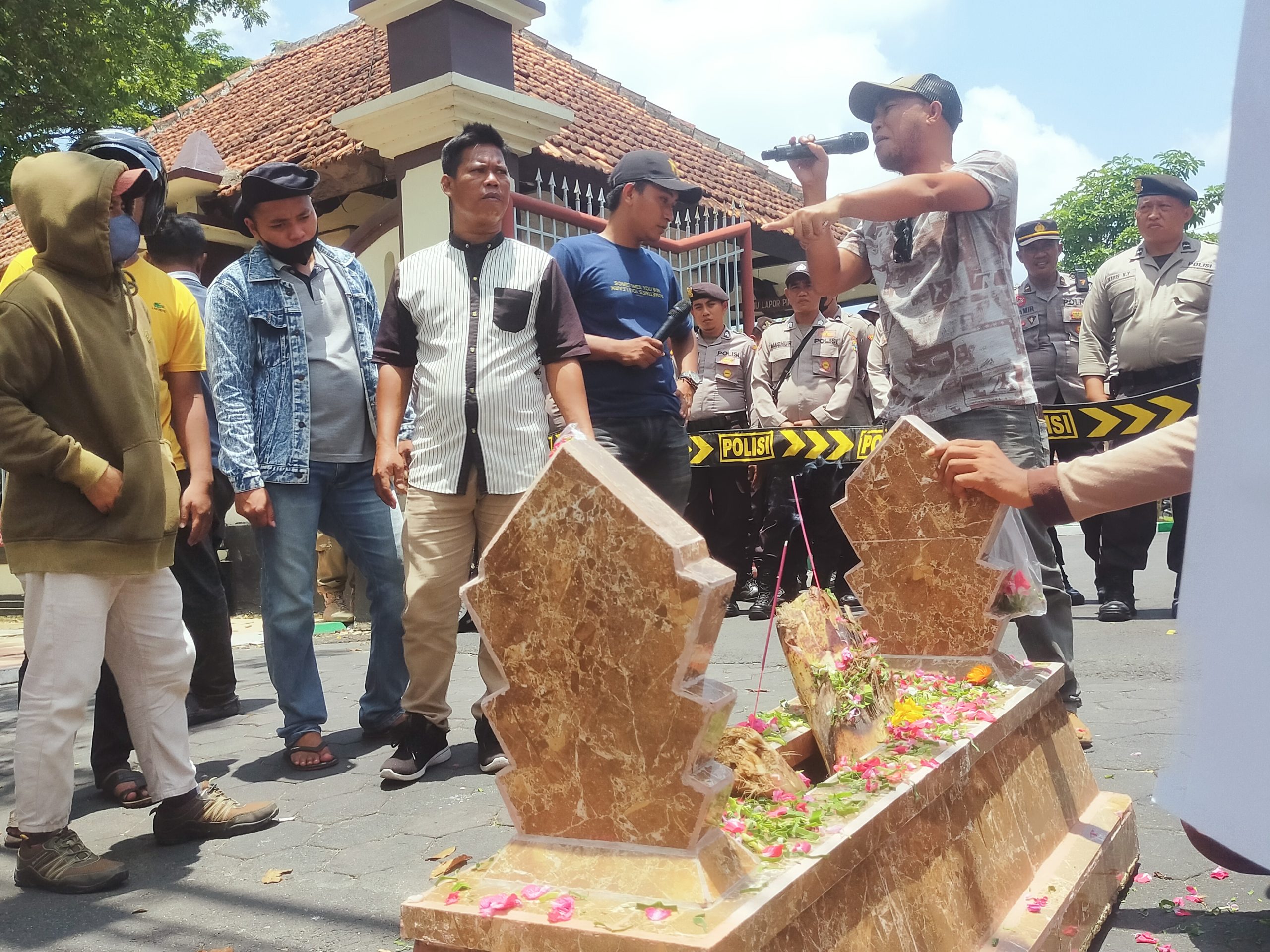 Dengan membawa batu nisan, membakar kemenyan, tabur bunga hingga menabur uang hasil penggalangan dana yang dilakukan beberapa waktu lalu guna membantu pemerintah untuk segera melakukan pembayaran pajak kendaran.