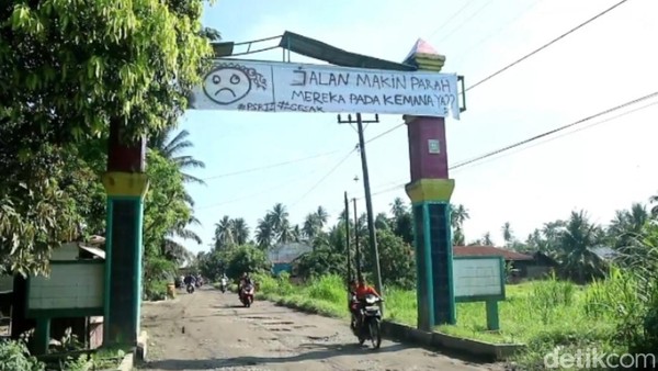 Pantauan awak media ini di lokasi, Rabu (5/4/2023) pada gapura jalan tersebut terdapat selembar spanduk berisikan kekesalan warga pada kondisi jalan yang tak kunjung mendapatkan perbaikan dari tahun ke tahun.