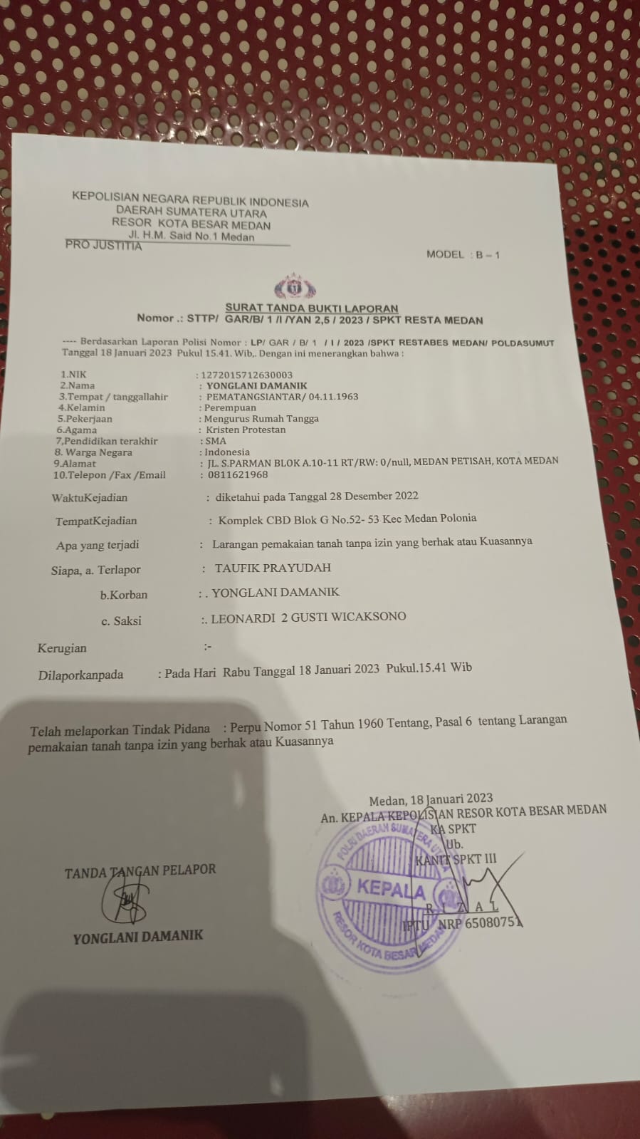 Dalam hal ini, bahwa sang pemilik gedung ‘YD’ sudah melaporkan atas tindak pidana dalam Perpu 51 Tahun 1960, Tentang Pasal 6 terkait larangan pemakaian tanpa izin yang berhak atau kuasanya, sehingga dalam Surat LP No. STTP/GAR/1/I/2023/SPKT RESTABES MEDAN/POLDA SUMUT, telah terjadi tindak pidana kepada pihak penyewa/pengontrak gedung.