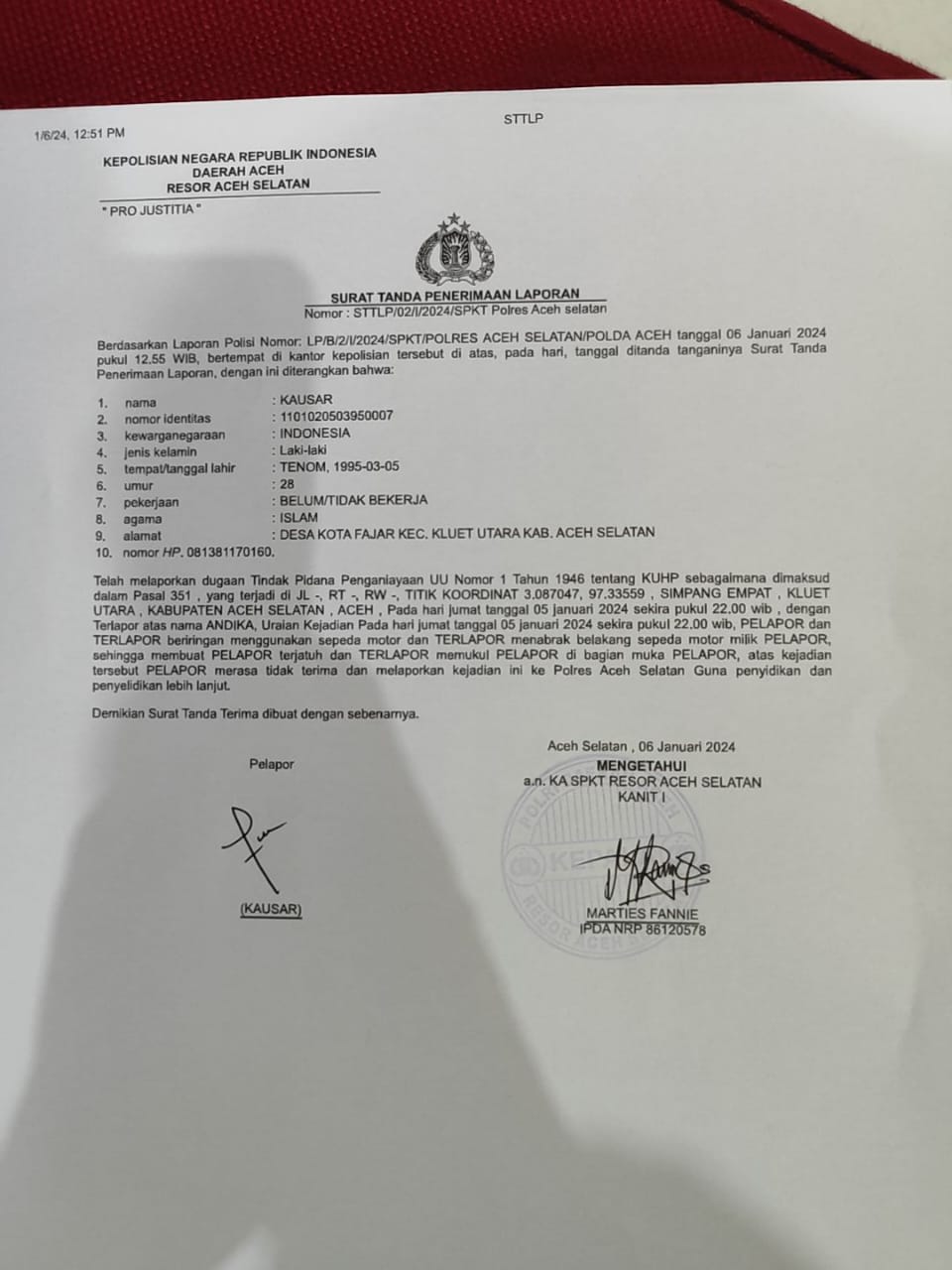 Menanggapi hal itu, Kausar didampingi Ketua PWI Aceh Selatan, Yunardi dan sekretaris PWI Aceh Selatan, Sudirman telah melakukan pelaporan di Polres Aceh Selatan dengan surat Laporan Polisi Nomor: LP/B/2/I/2024/SKPT/POLRES ACEH SELATAN.