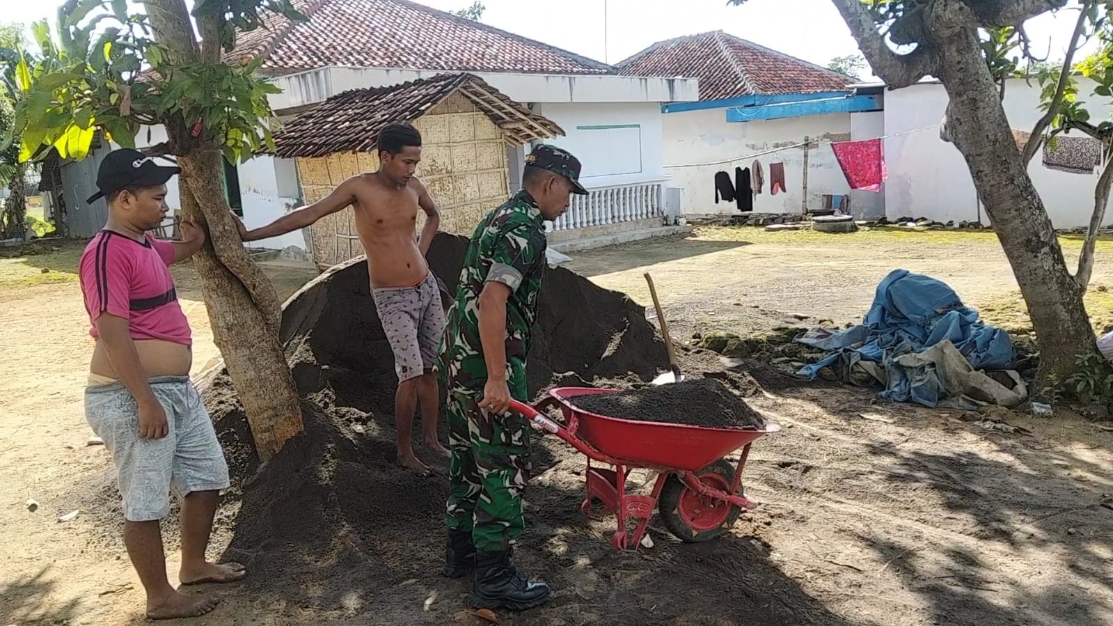 Babinsa Koramil 0826-01/Pamekasan Turun Tangan Bantu Warga Gotong Royong Angkut Pasir di Parteker