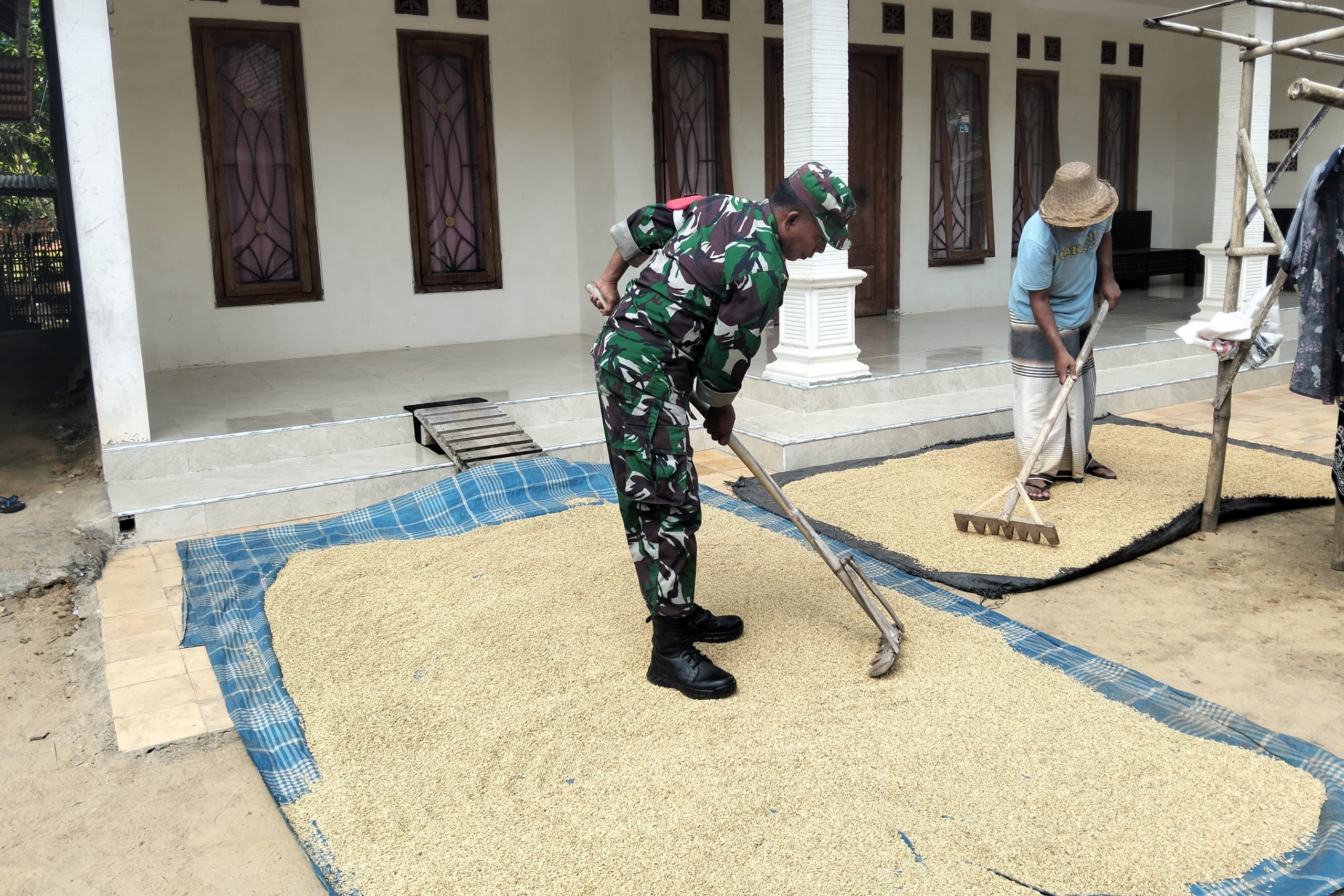 Babinsa Tlanakan Bantu Jemur Gabah Warga, Dukung Kualitas Hasil Panen Padi