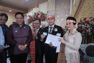 Sumatera Utara, CYBERJATIM.ID – bupati Dairi Eddy Keleng Ate Berutu menyerahkan langsung akta nikah untuk pengantin baru Dhaniel Manurung dan Anggun Pardede, bertempat di Sopogodang HKBP Sidikalang pada jumat, (24-02/2023).