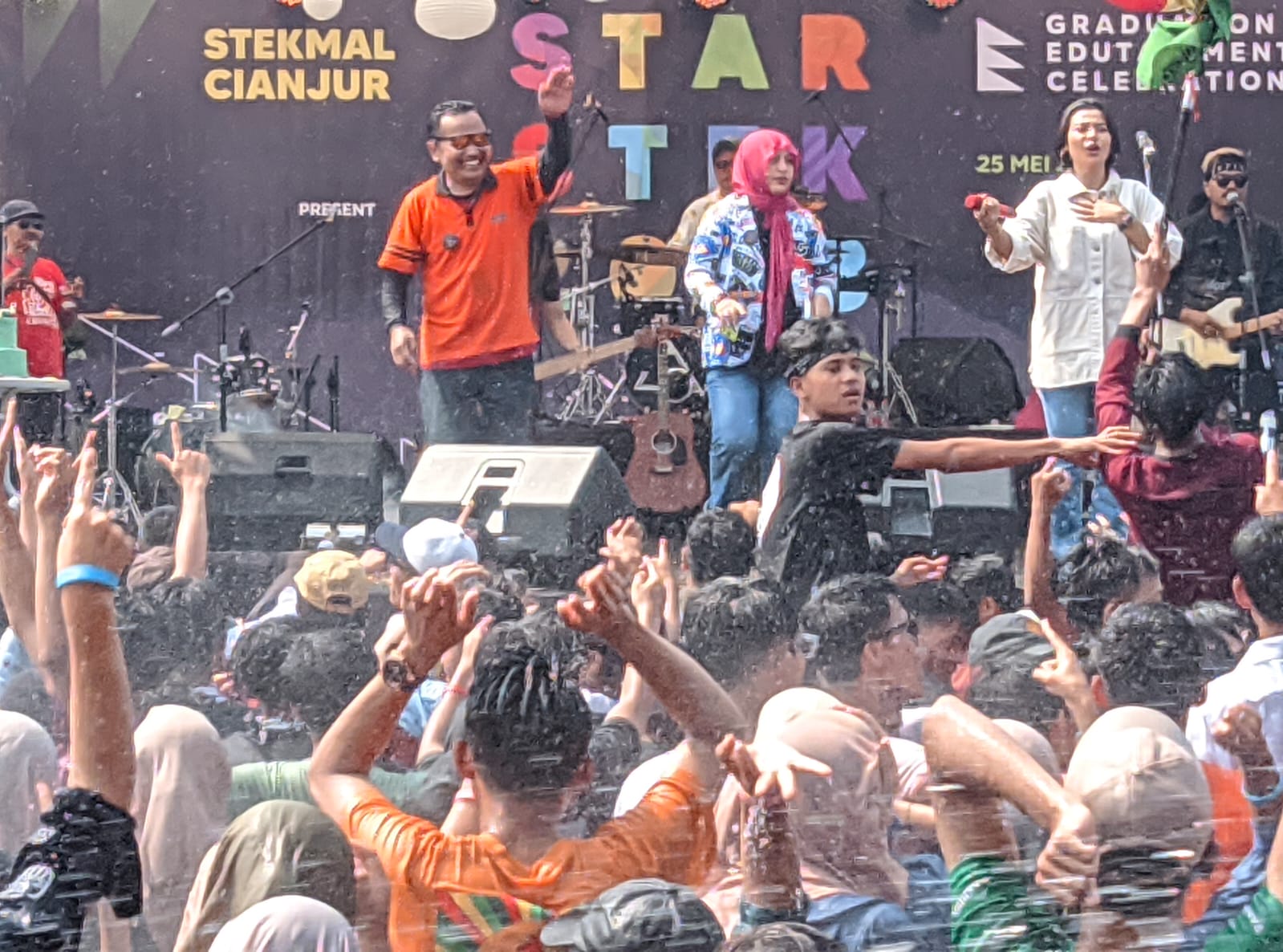 Siswa-siswi dan para guru pun larut dalam lantunan lagu-lagu yang dibawakan bintang tamu ditengah guyuran air dari petugas Damkar Cianjur.