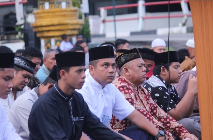 Aceh Selatan-Cyberjatim.id. Komandan Kodim 0107/Aceh Selatan Letnan Kolonel Arh Helmy Ariansyah, SE, Ketua Persit KCK Cabang XXIX Kodim 0107 Ny. Dewi Helmy bersama Anggota dan masyarakat menunaikan Shlat Idul Adha 1444 yang di gelar di halamam Makodim Desa lhok Bengkuang Timur Kecamatan Tapaktuan Kabupaten Aceh Selatan, Kamis (29/06/2023).
