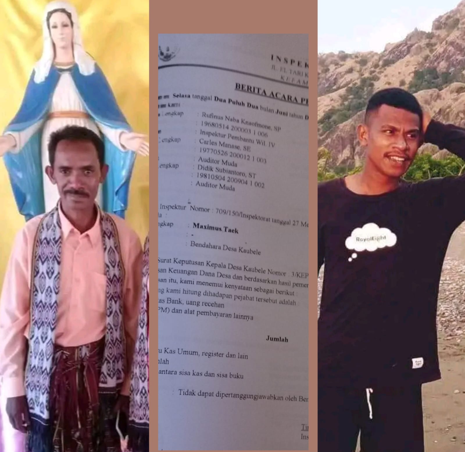 1. Pada saat pemeriksaan inspektorat ditemukan ketekoran khas dalam pengelolaan dana desa dan alokasi dana desa tahun anggaran 2018 hingga 2020 sebesar, Rp 32. 287.005.77 dan tidak dapat dipertanggungjawabkan oleh bendahara Desa Kaubele Maximus Taek dengan bukti yang lengkap dan sah dari total sisa kas sebesar Rp, 313.458.384 dengan rincian terlampir.