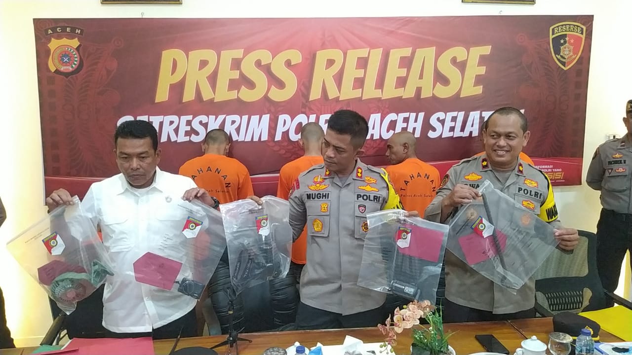 Aceh Selatan-Cyberjatim.id. Polres Aceh Selatan Gelar Press Realise empat kasus yaitu Tindak Pidana Korupsi, Pelecehan Sexsual, Pencurian di Gampong Padang dan Pencurian di SMK 1 Kluet Selatan.