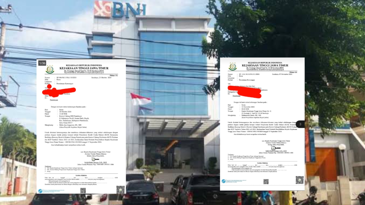 Permintaan keterangan terhadap dua petugas KCP BNI Tamberu sesuai dengan perintah penyelidikan kepala Kejaksaan Tinggi Jawa Timur nomor : 1803/M.5/Fd.1/09/2024 tanggal 17 September 2024.
