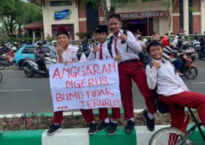Salah satu poster yang dipegang oleh anak SD merupakan bagian dari tuntutan PC PMII Pamekasan " Anggaran Dikerus, BUMD Tidak Terurus"