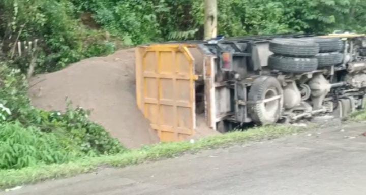 Aseng warga setempat mengabarkan insiden tumpah pasir di karnakan ban truck dump fuso tersebut selip,sehingga di duga sang supir tersebut hilang kendali. sedangkan truck Fuso bermuatan pembawa besi behel mengalami selip juga, tapi mengalami terbalik. terjadi sekitar jam 5.00 WIB.