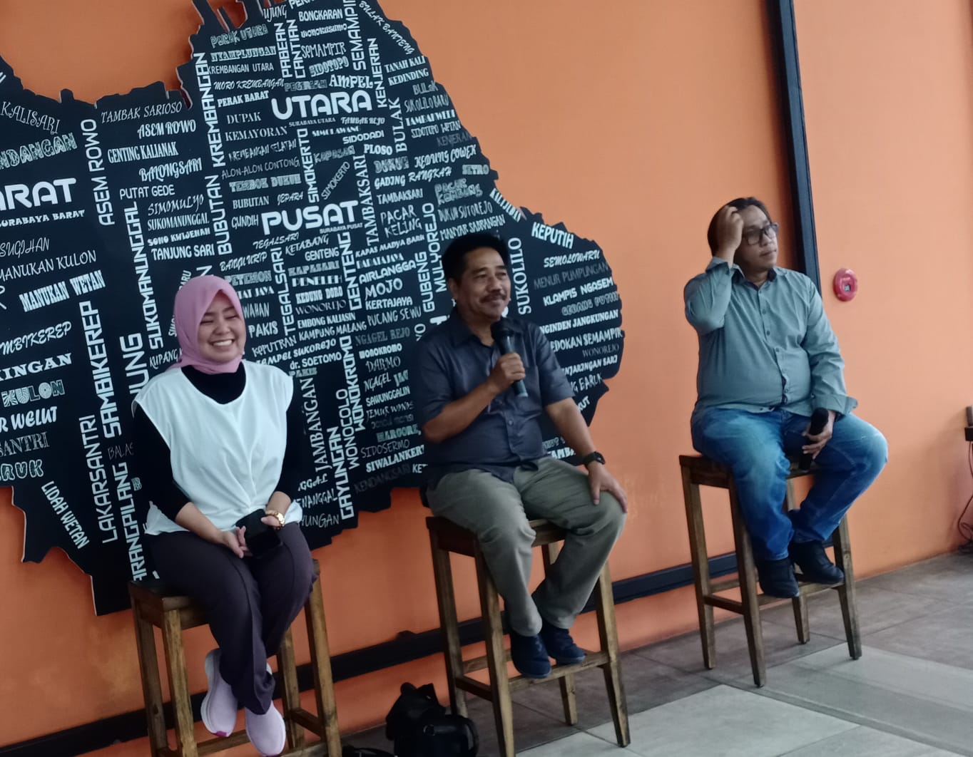 Mereka melihat langsung proses siaran radio Suara Surabaya FM dan bincang dengan tim redaksi suarasurabaya.net, tim media sosial, tim grafis dan mendapat wawasan tentang industri media massa radio dari Eddy Prastyo, Manager Produksi Suara Surabaya.