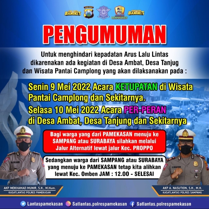 Pengalihan arus lalu lintas yang dilakukan oleh Satuan Lalu Lintas ( Satlantas ) Polres Pamekasan dikarenakan ada giat Ketupatan pada tanggal 9 Mei 2022 dan acara Per – Peran pada tanggal 10 Mei 2022 Desa Ambat, Desa Tanjung dan sekitarnya.
