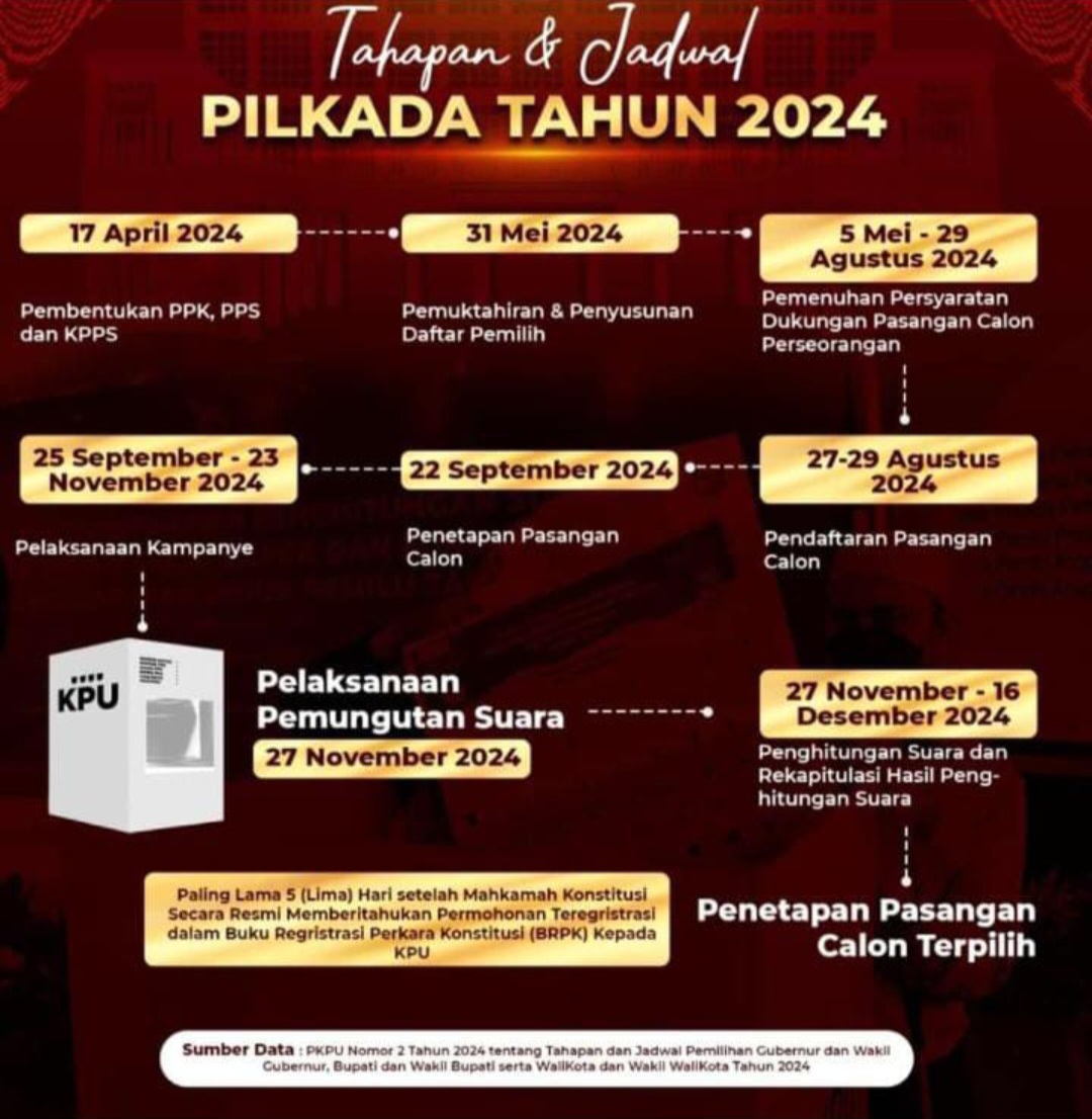 KPU dalam akun resminya mengeluarkan daftar tahapan dan jadwal pilkada tahun 2024, 17 April 2024 pembentukan PPK, PPS dan KPPS, 31 mei 2024 pemutaakhiran dan penyusunan daftar pemilih, 5 Mei sampai 29 Agustus 2024 pemenuhan persyarakatan dukungan pasangan calon perseorangan, 27 sampai 29 Agustus 2024 Pendaftaran pasangan calon, 22 September 2024 penetapan pasangan calon, 25 September sampai 23 November 2024 pelaksanaan kampanye, 27 November 2024 Pelaksanaan pemungutan suara, 27 November sampai 16 Desember penghitungan suara dan rekapitulasi hasil penghitungan suara.