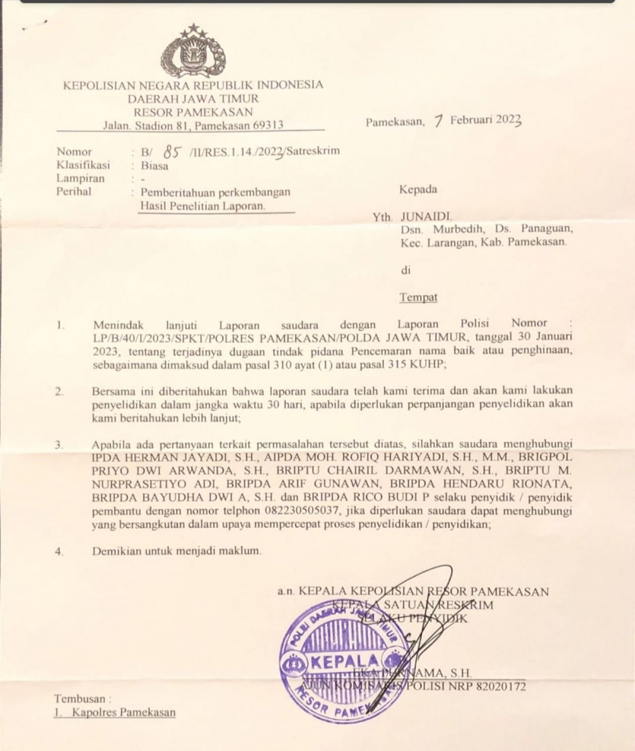 Viralnya kasus tersebut terbukti dari munculnya surat bukti laporan yang dikeluarkan Mapolres Pamekasan dengan nomor : LP/B/40/I/2023/SPKT/POLRES PAMEKASAN/POLDA JAWA TIMUR tertanggal 30 Januari 2023, tentang terjadinya dugaan tindak pidana pencemaran nama baik atau penghinaan. Sebagaimana dimaksud dalam pasal 310 ayat 1 atau pasal 315 KUHP.