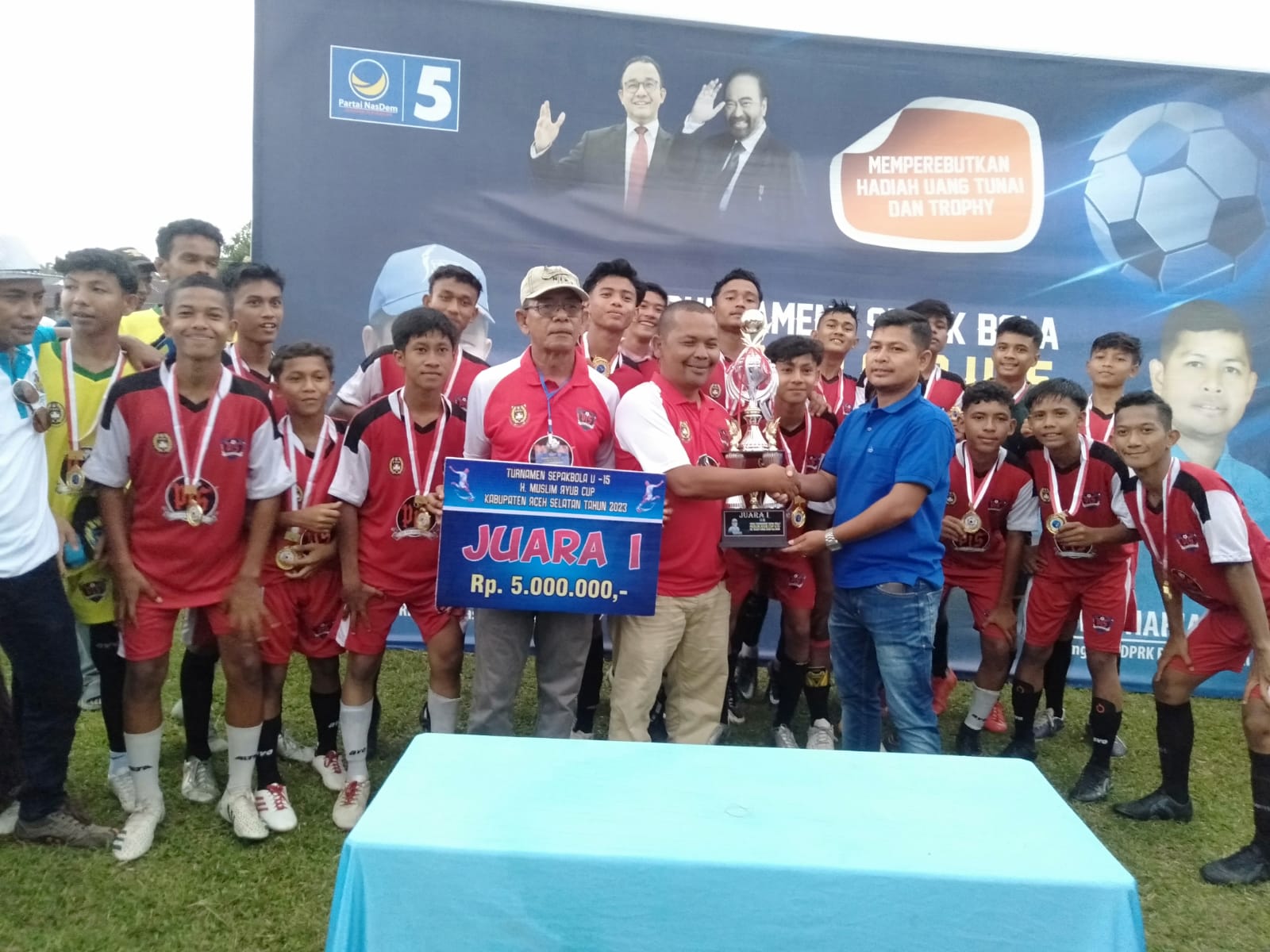 ACEH SELATAN-CYBERJATIM.ID. Tim kesebelasan Pis Media Samadua berhasil menjuarai turnamen bola kaki H. Muslim Ayub Cup Tahun 2023, setelah mengalahkan tim Mawar FC Suak Bakung dengan skor 3-0 pada partai final yang berlangsung di Lapangan Bola Kaki Mawar FC, Senin (27/2/2023) sore.