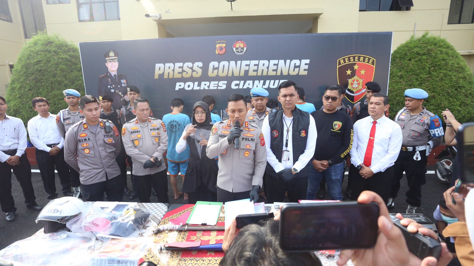 “Dalam kejadian tersebut, kami mengamankan 3 orang pelaku yang berinisial ES, RA, EG dan yang lainnya masih dalam pengejaran, barang bukti yang kami amankan diantaranya 1 unit sepeda motor merk Honda Beat warna hitam yang dirusak oleh para pelaku, 1 unit sepeda motor merk Honda Scoopy warna merah dan 2 potong sweater yang digunakan oleh para pelaku.” ucap Kapolres Cianjur.