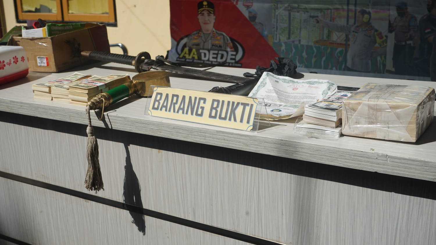 Kemudian bersama dengan barang bukti didapatkan beberapa alat bukti yang digunakan tersangka T, dengan memberikan iming-iming untuk menyakinkan calon pembeli dengan peralatan benda yang dinilai benda keramat yaitu sebilah pedang, samurai gulung yang bisa potong paku, kuningan tertulis kan gold.