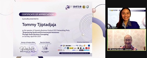 Selanjutnya, pre event 4 pun mengangkat tema “Empowering Social and Environment Awareness Through Green Business Concepting” yang dibawakan oleh Chief Executive Officer dan Co-Founder dari Greenhope.co, Tommy Tjiptadjaja.