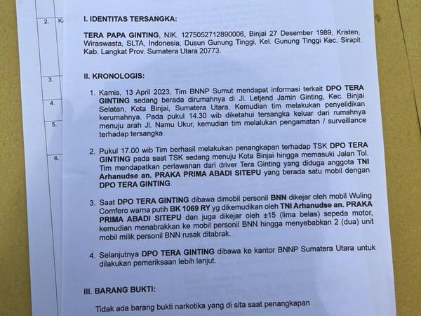 Dalam kertas itu berisi penjelasan pada Kamis (13/4/2023) pihak BNNP Sumut dapat informasi Tera sedang berada di rumahnya,Jalan Letda Jamin Ginting, Binjai Selatan, Kota Binjai