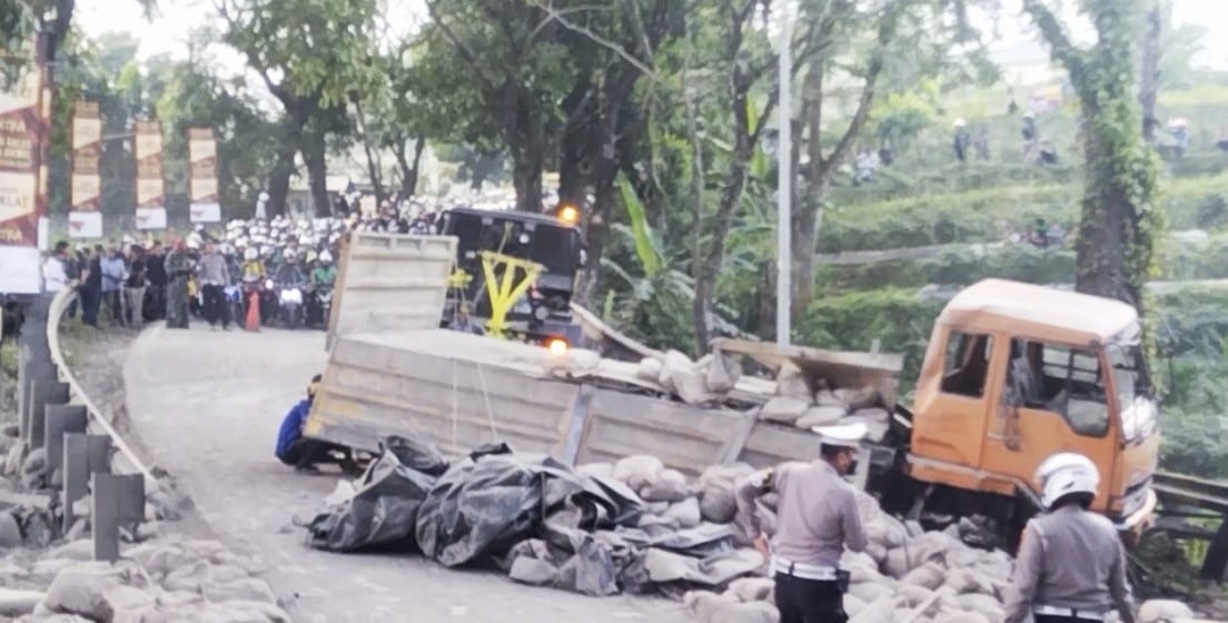 Cianjur, CYBERJATIM.ID – Kecelakaan tunggal yang mengakibatkan satu unit truk fuso pengangkut semen terguling di Jl. Raya Cibeureum, Desa Cugenang, Kecamatan Cianjur, Kamis 22 Juni 2023 dikarenakan gara- gara Human Eror.