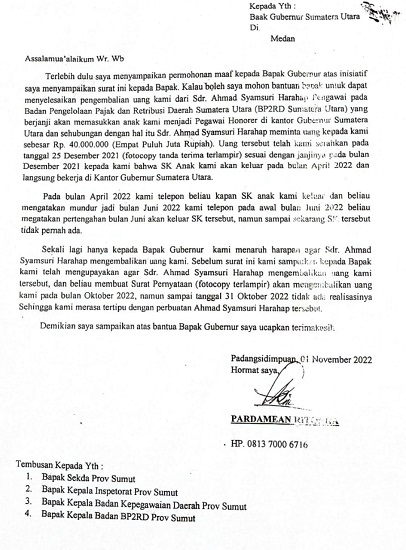 Sesuai dengan hasil pembicaraan kami, lanjut Pardamean Ritonga, untuk SK pengangkatan anaknya menjadi tenaga honorer di Kantor Gubernur Sumatera Utara akan diterbitkan atau keluar pada April 2022 yang silam.