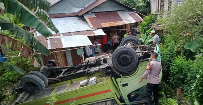 Selanjutnya, pengemudi mencoba mengerem namun rem truk yang dikendarai itu blong, sehingga berjalan mundur -+20 meter dan terperosok sehingga terbalik di bawah talut pinggir jalan depan mesjid.” Jelas Moyo.