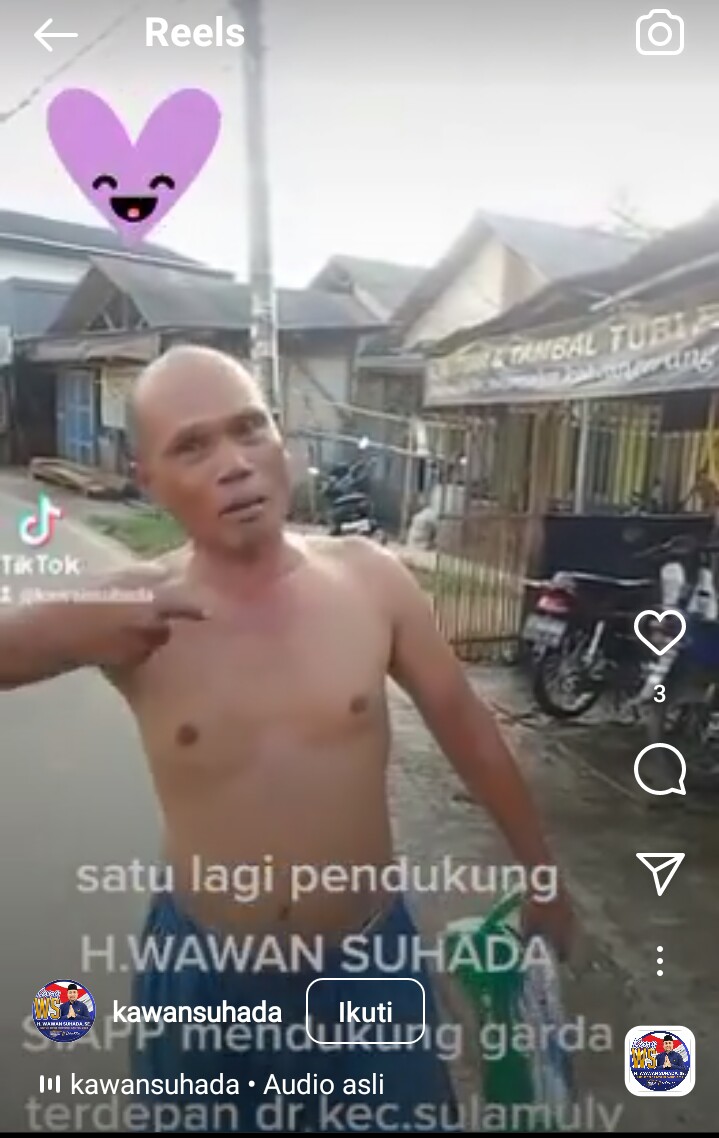 “Assalamualaikum, mau hujan mau angin, saya dukung pak Haji Wawan harus menang, jaya selalu, nih yang namanya Drs. Muhamad Nurjaya selalu dukung pak Haji Wawan, mau hujan mau angin, sukses pak Haji Wawan, okee ” ujar Nurjaya dengan nada teriakan keras sambil pegang poster.