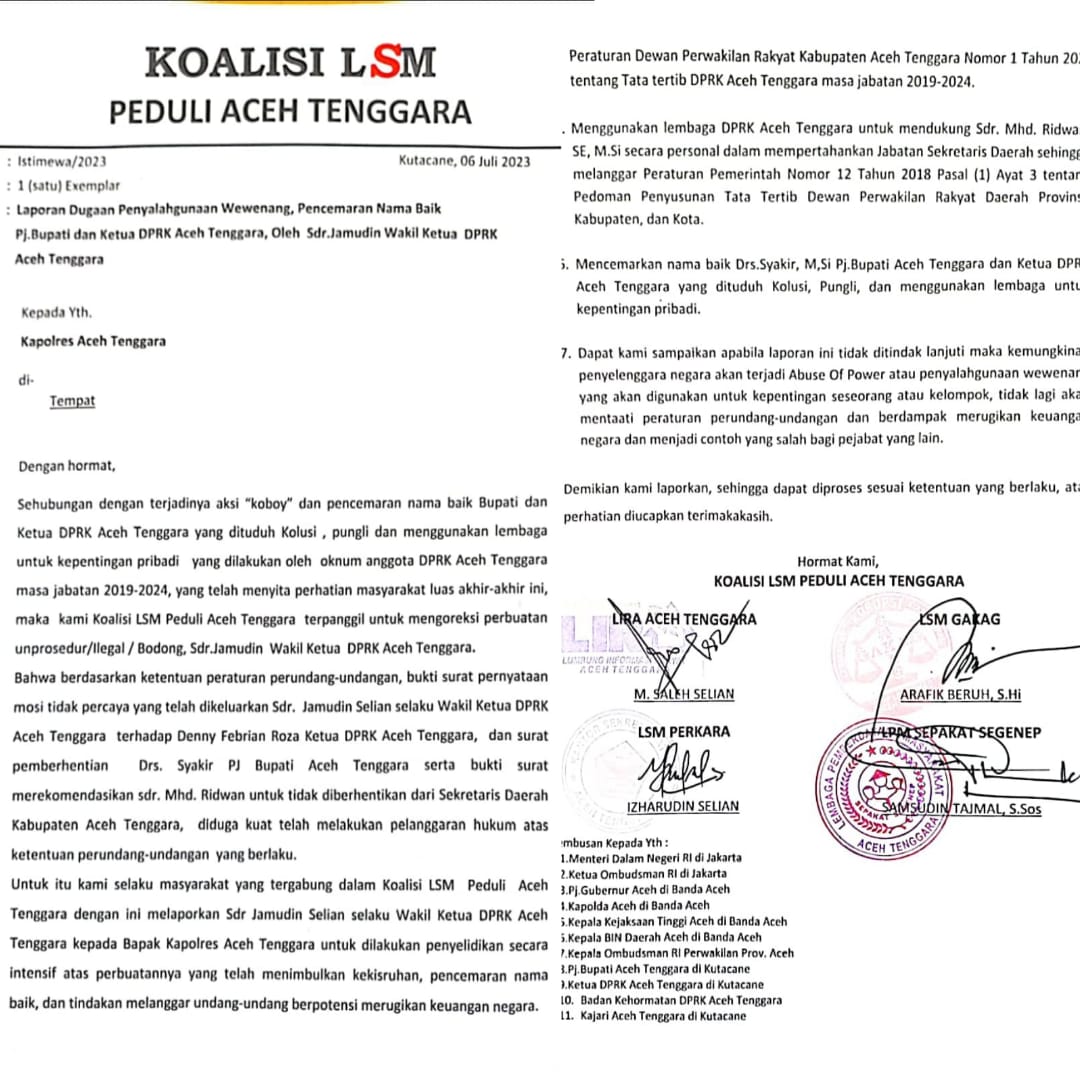 Dikatakan, pencemaran nama baik terhadap Pj Bupati Syakir dan ketua DPRK Denny Febrian Roza, seperti tuduhun kolusi, pungli dan mengunakan lembaga untuk kepentingan pribadi, seperti tercantum dalam surat Pemberhentian Pj Bupati Aceh Tenggara. Surat ini dikeluarkan di kutacane pada 20 Juni 2023 dengan nomor 103/ DPRK – AGARA/VI/2023. Ditandatangani oleh Jamudin serta 21 anggota DPRK lainya.